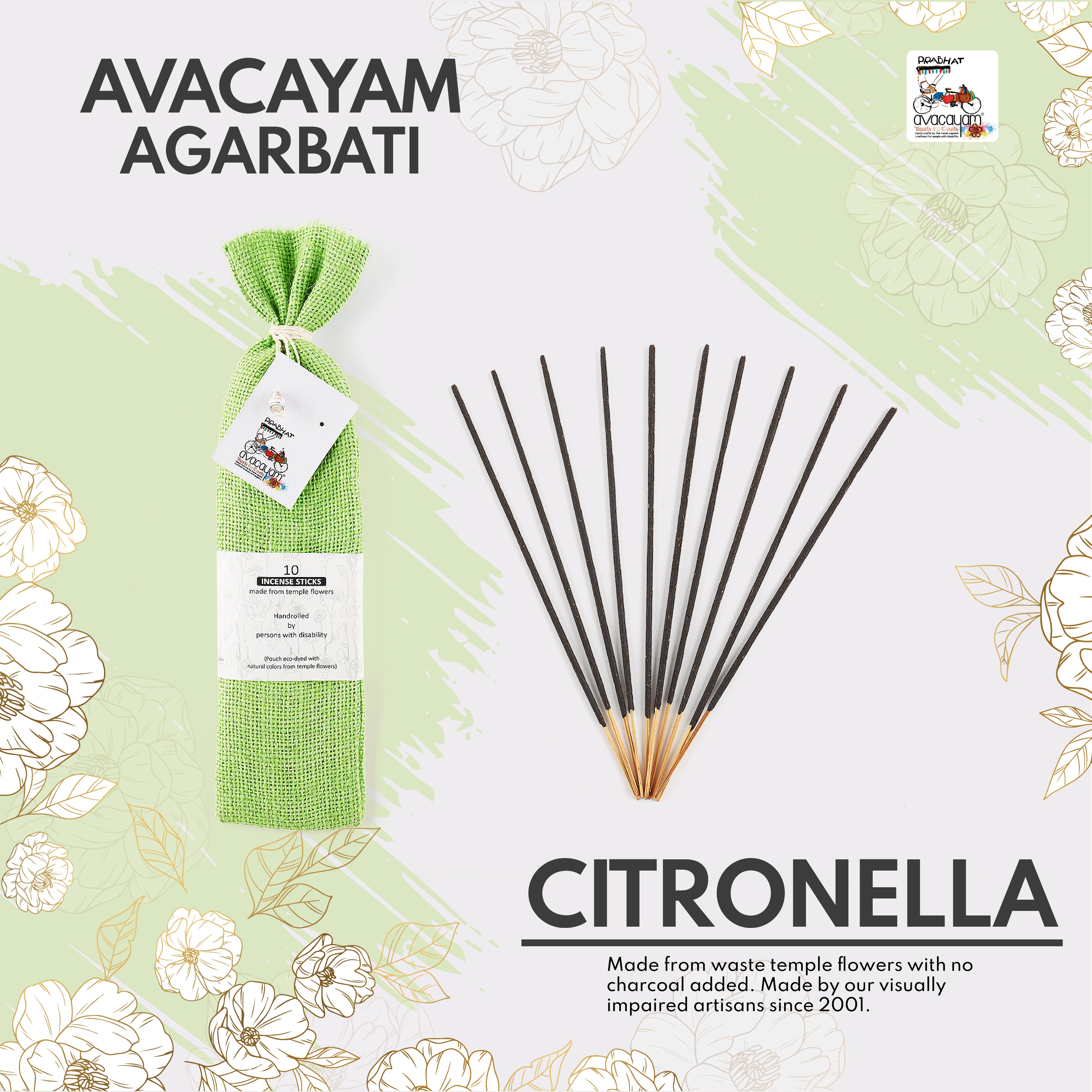 Experience the calming aroma of Citronella with these eco-friendly, hand-rolled agarbattis, made entirely from recycled temple flowers. Our incense sticks are 100% charcoal-free, offering a cleaner and more natural fragrance experience.