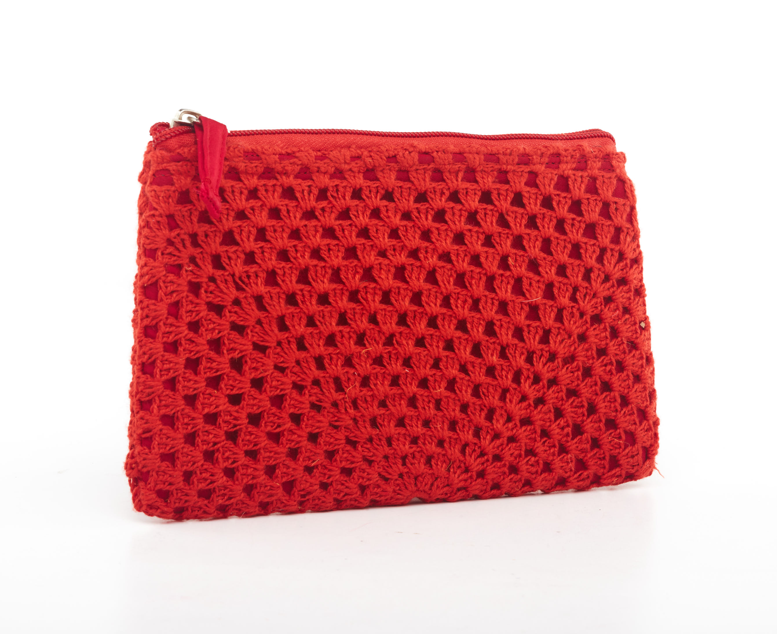 Vibrant and handy, this bright red crochet pouch is great for carrying cosmetics, toiletries, or tech accessories. Its soft, textured design and zip closure make it both practical and beautiful. -
