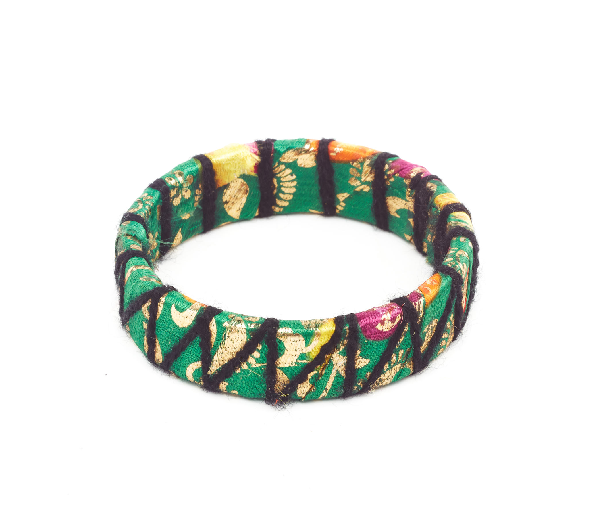 A playful pop of color, this fabric-wrapped bangle features a blend of green, pink, and black. Lightweight and bold, it brings handmade charm to any outfit. -