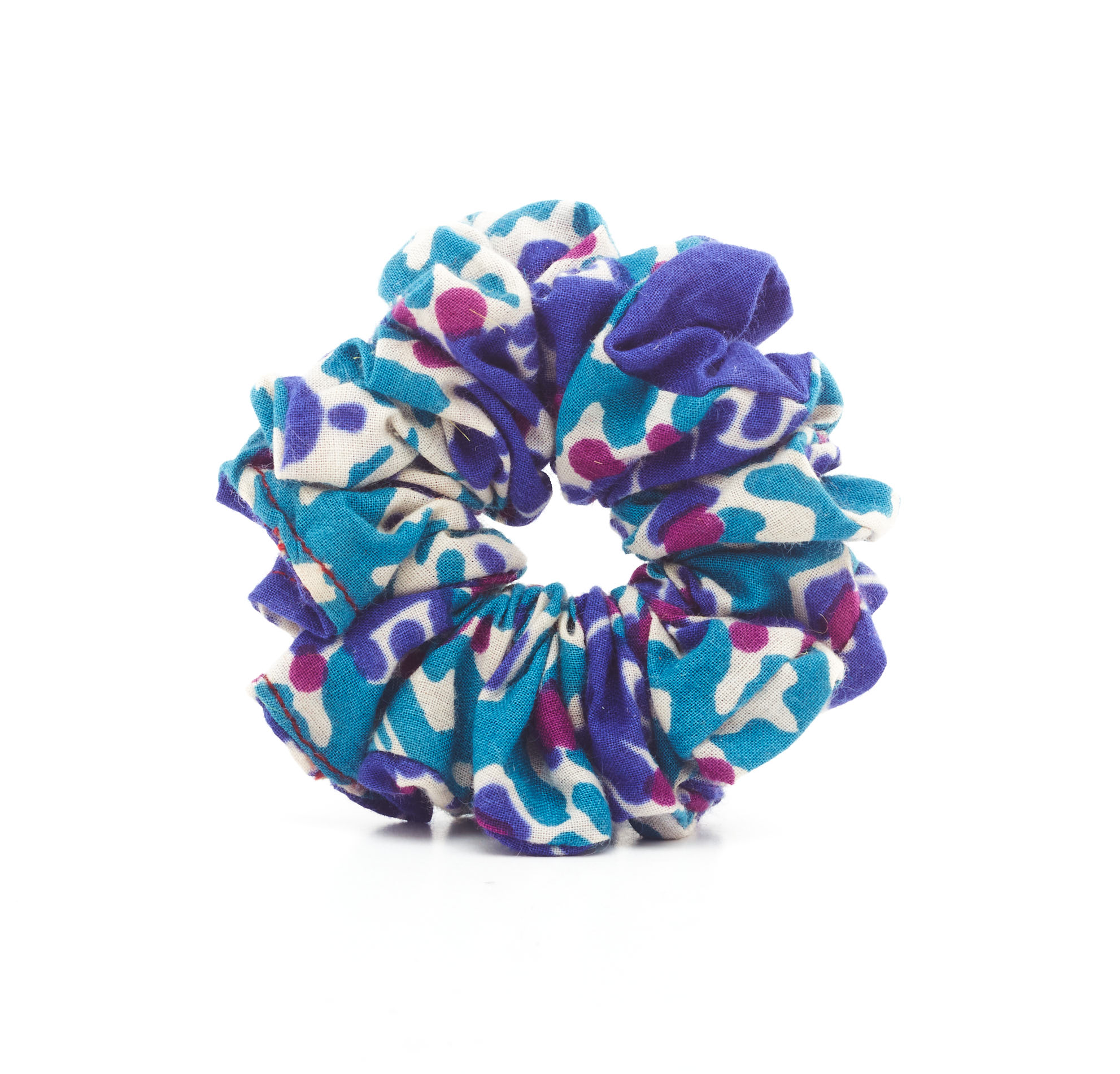 This soft scrunchie is crafted from floral-printed fabric in deep blue and purple tones. Gentle on the hair and perfect as a casual wrist accessory too.