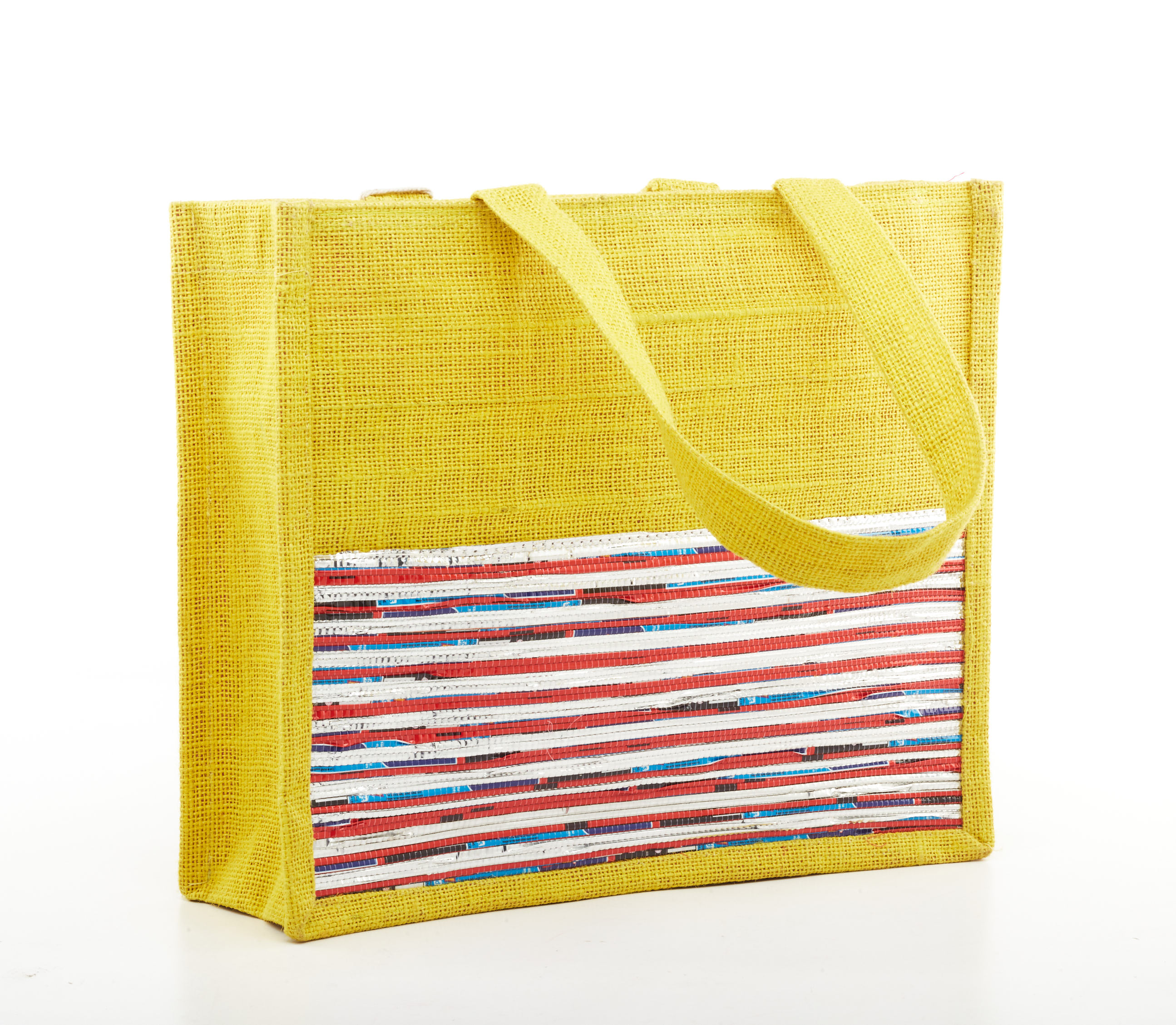 1 Yellow Jute Side Bag with Multicolor Striped Panel