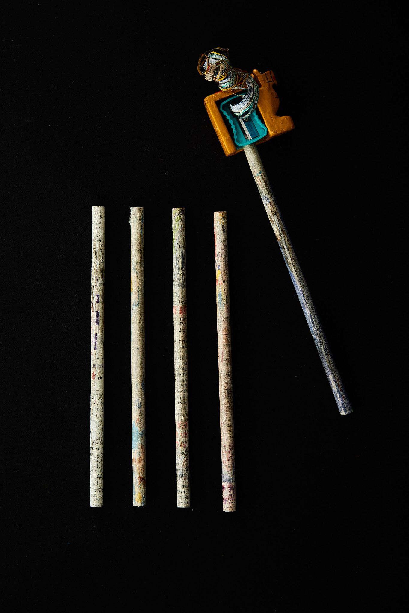 This Pencil and Sharpener is made of newspaper & wood respectively.