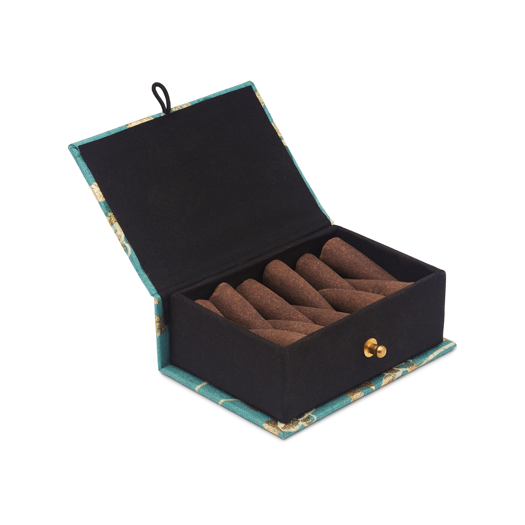 A perfect blend of elegance and tradition, this handcrafted dhoopbatti box is wrapped in teal fabric with delicate golden floral motifs. The contrast black body and secure string-button closure give it a refined finish, making it a lovely accessory for spiritual spaces, gifting, or home décor.