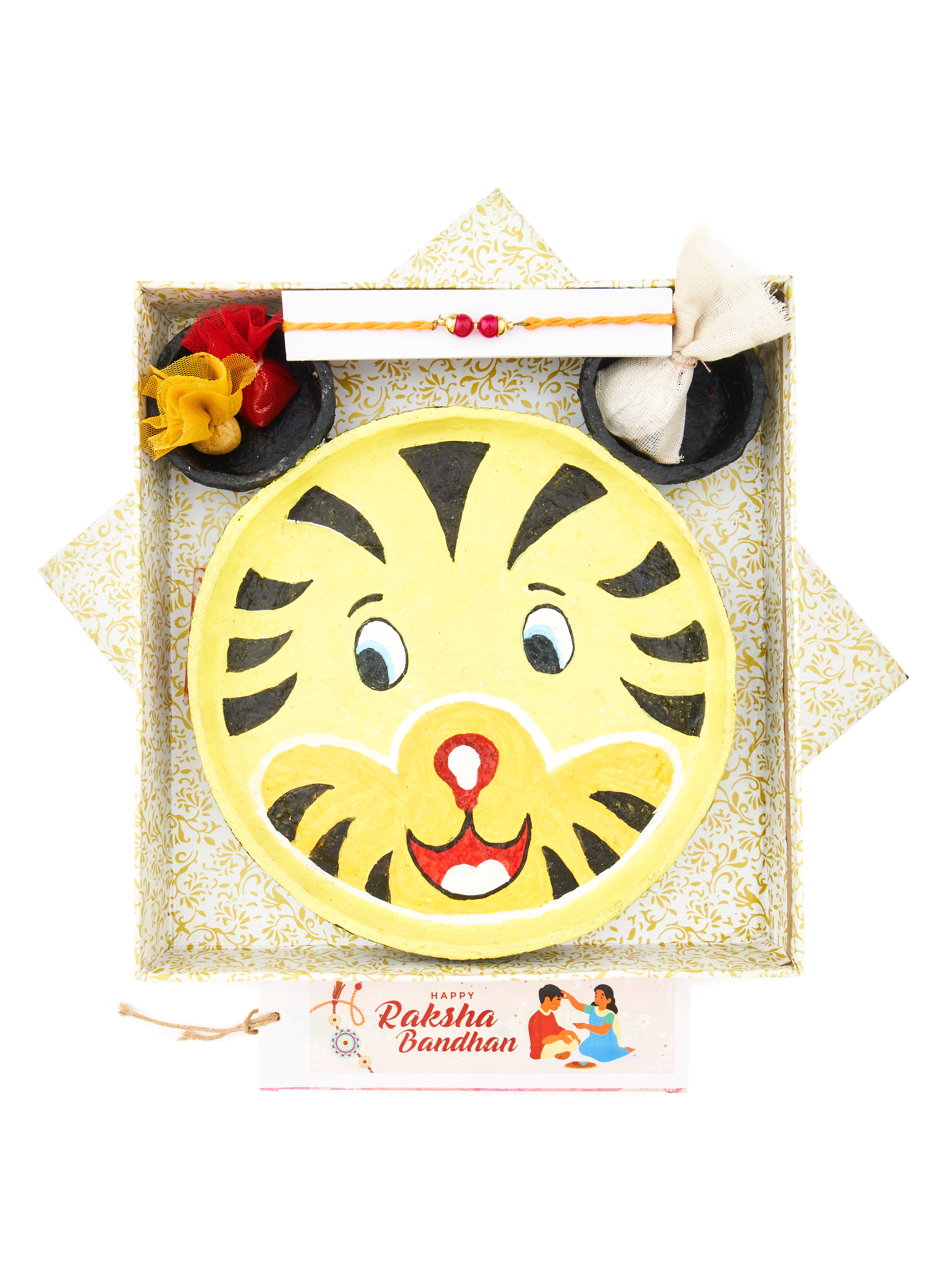 Make this Raksha Bandhan wild and wonderful with our Tiger Tickle Rakhi Thali Set! Adorned with a cheerful hand-painted tiger face, this vibrant yellow thali is perfect for adding a playful jungle twist to your festive celebration—especially loved by kids and animal lovers alike.